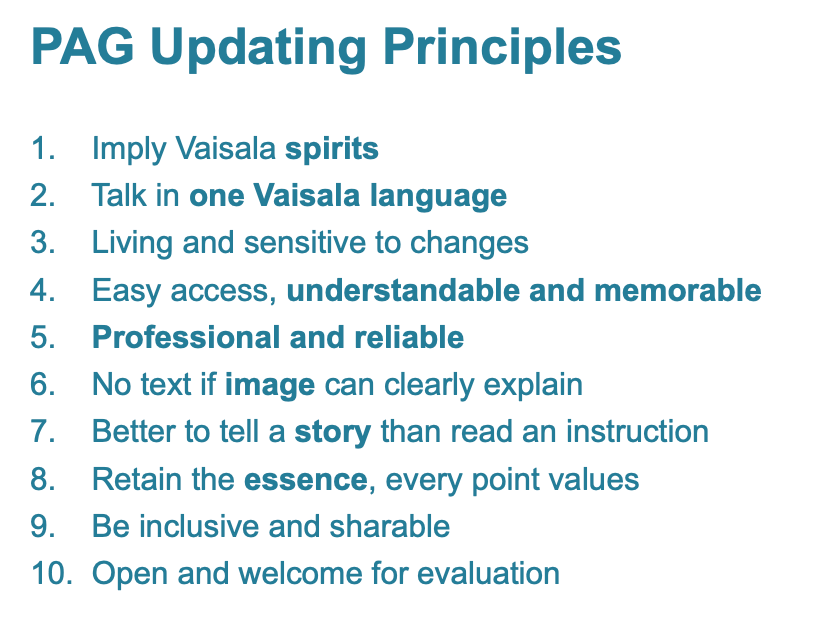 The Industrial Design Guideline (PAG) was updated to be a separate section on the new Sharepoint of Vaisala’s internal website. Following the mindset of doing service design, I first defined the updating principles and the focus of work as below: