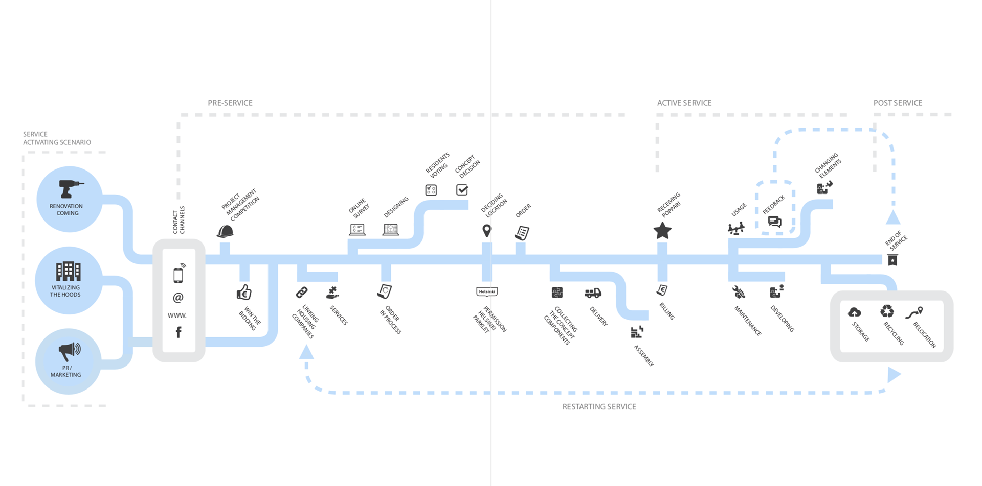 From the event and the workshop, Kalasatama residents actively showed great interests in applying some empty spaces to offer pop-up services, also as a way to vitalize the neighborhood. So we generated a service structure to elaborate how it could work with Vahanen housing company.